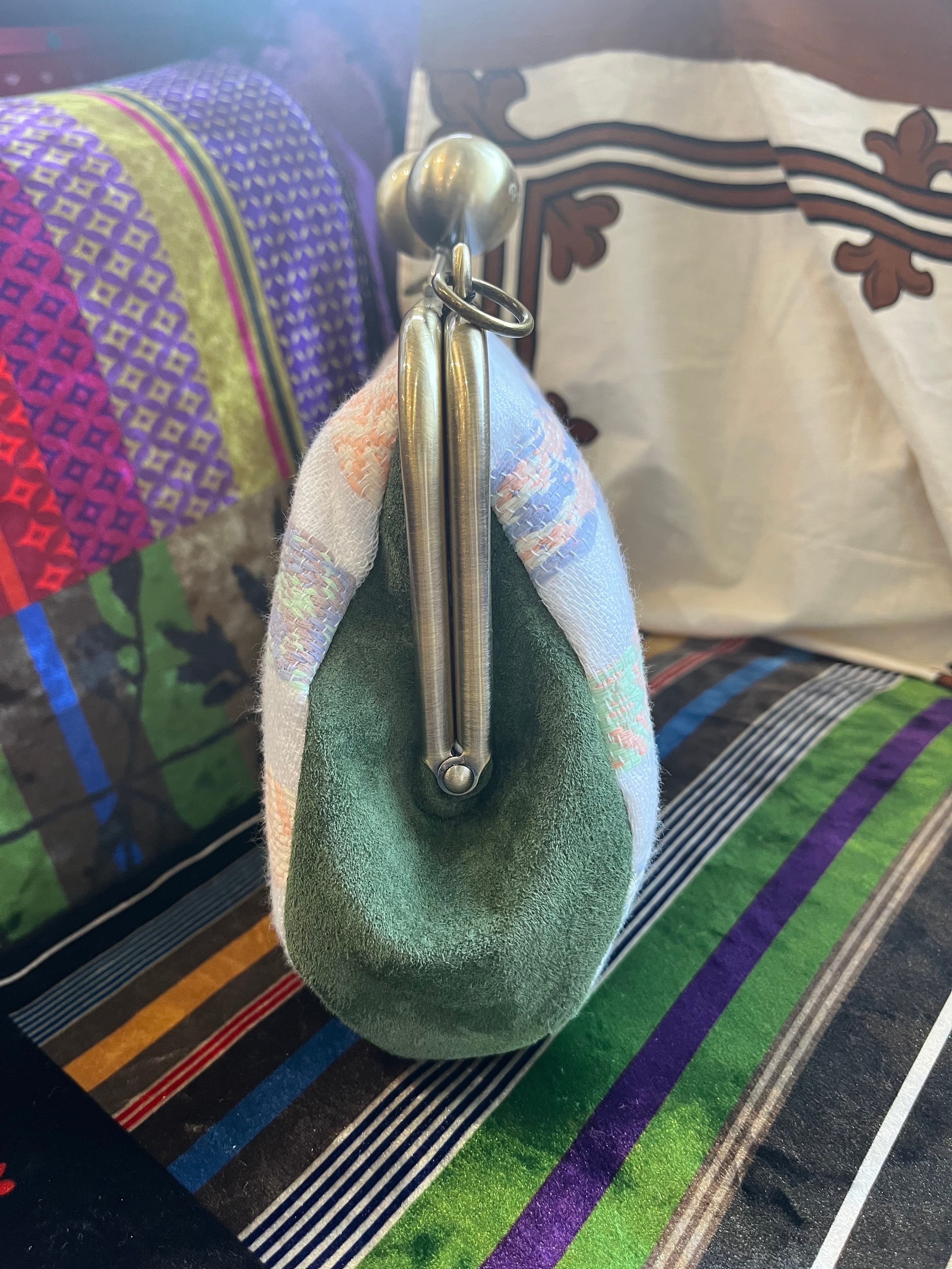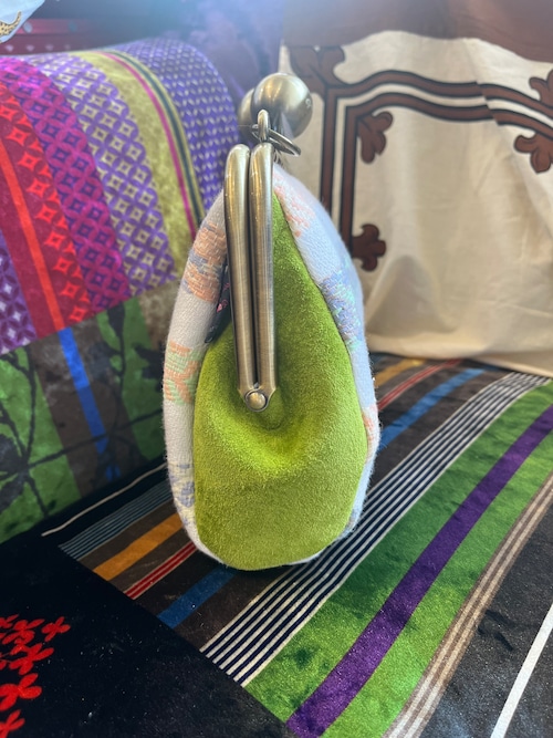 ベースのパステル調のボーダー生地に、ピッグレザーのグリーンをサイドに合わせた可愛らしいデザインです。