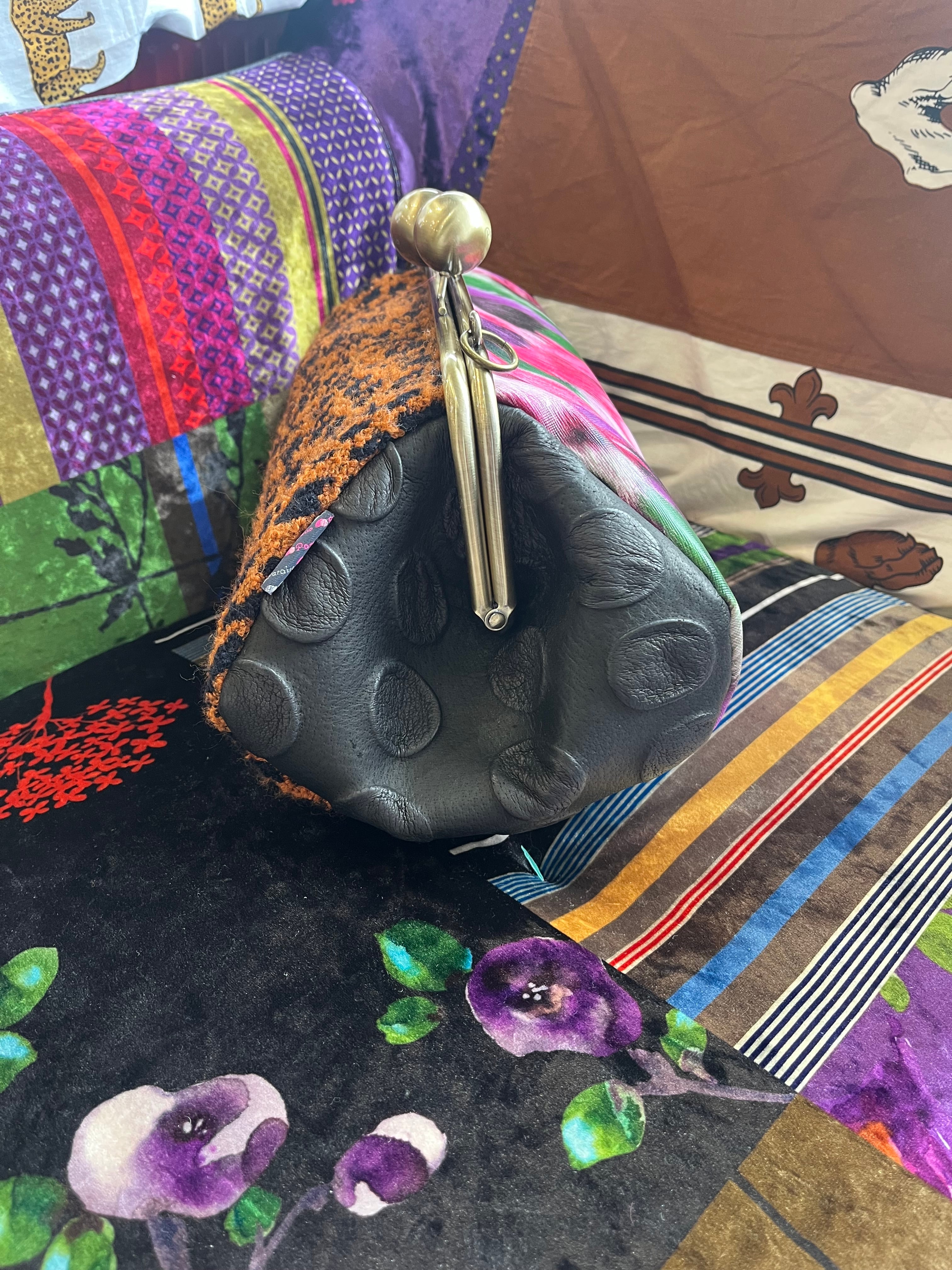 表面は大胆なレオパード柄の生地を、裏面は鮮やかなファープリントを施した生地を使用しています。