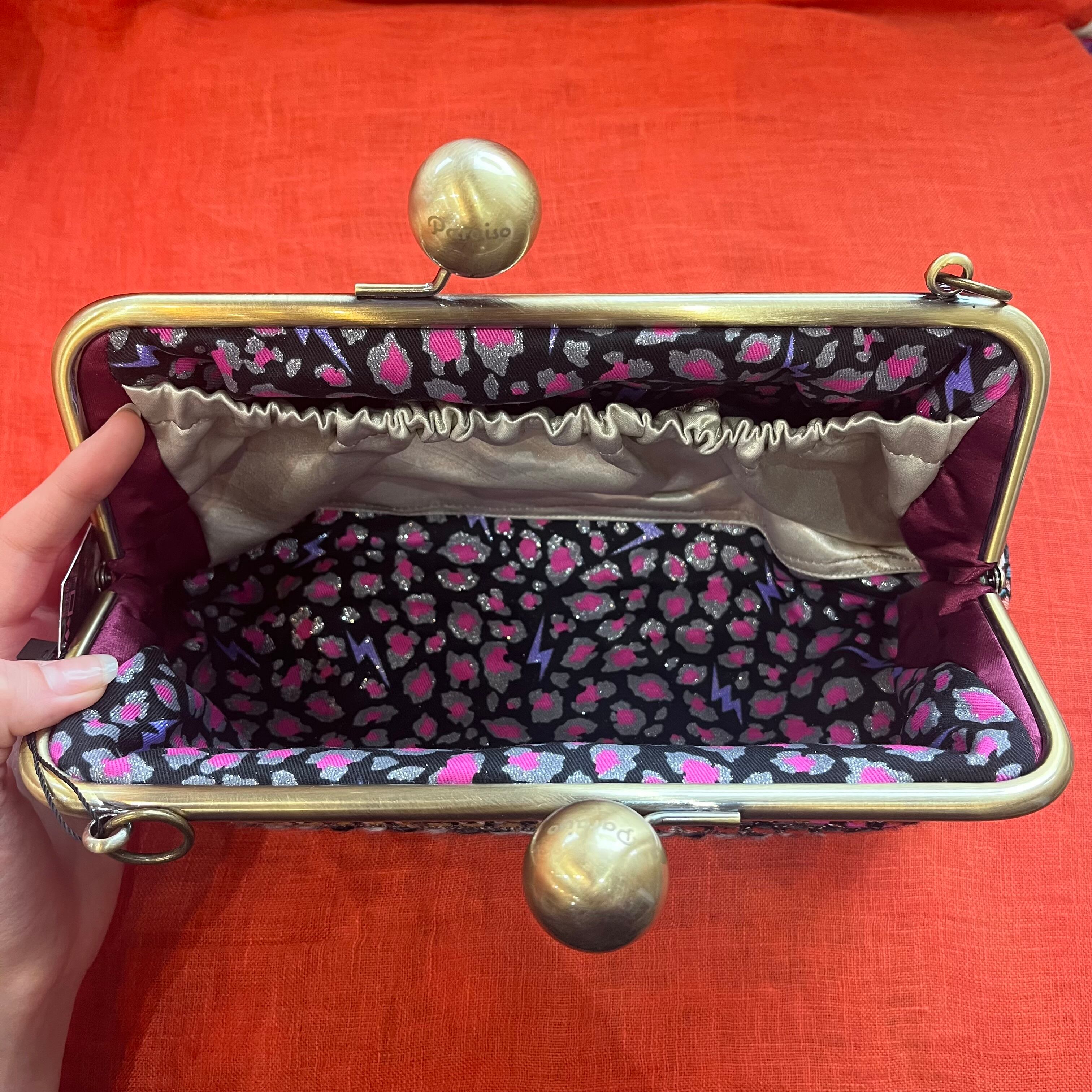 両面にブラックを基調とし、ピンク・オレンジ・イエローなどカラフルなツイード生地を使用しています。ブラックを基調としているため、落ち着きのあるがま口バッグとなっています。