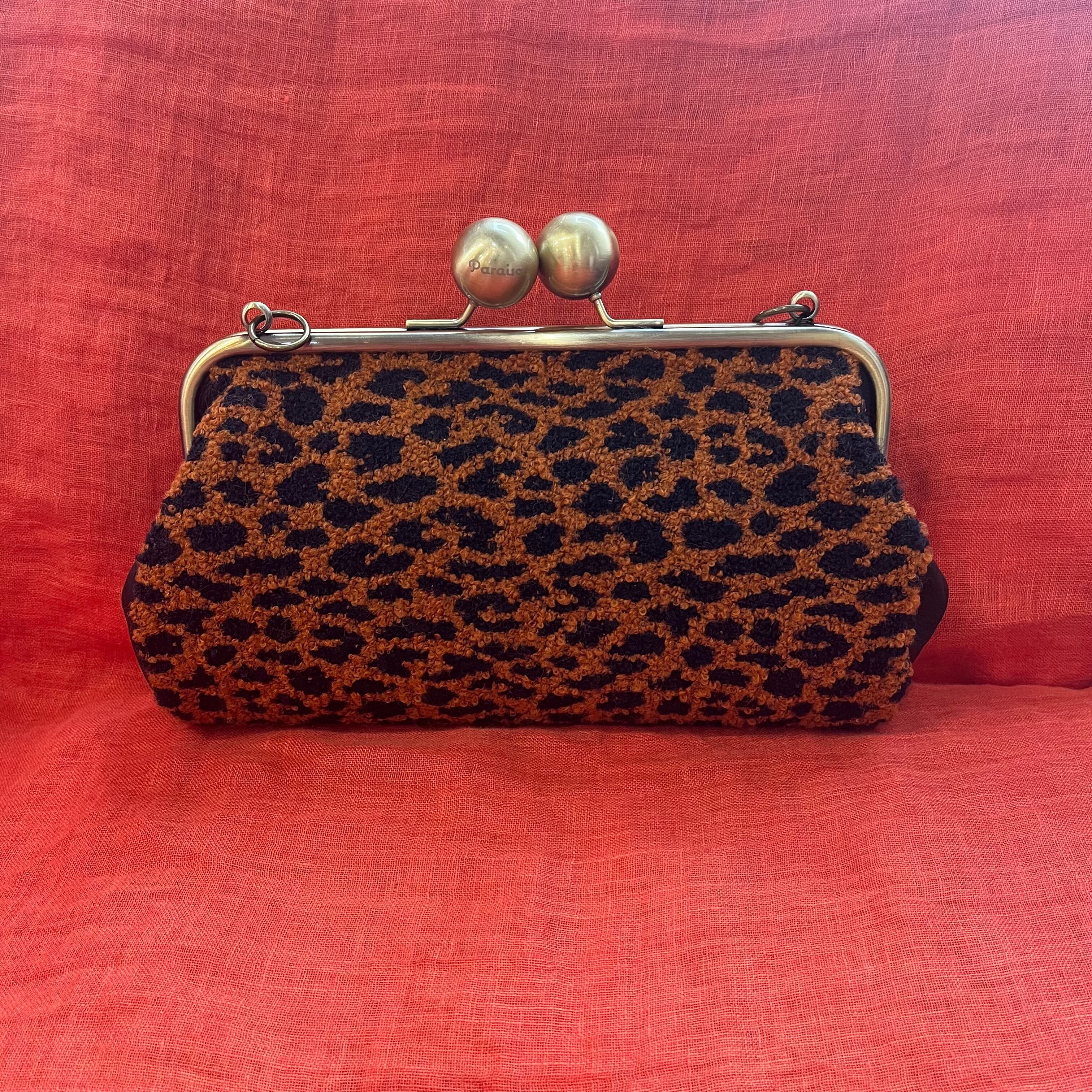 両面にオレンジのレオパード柄の生地を使用しています。サイドにはブラックの大人気高級レザーを使用しているため、存在感もありつつ品のあるがま口バッグとなっています。