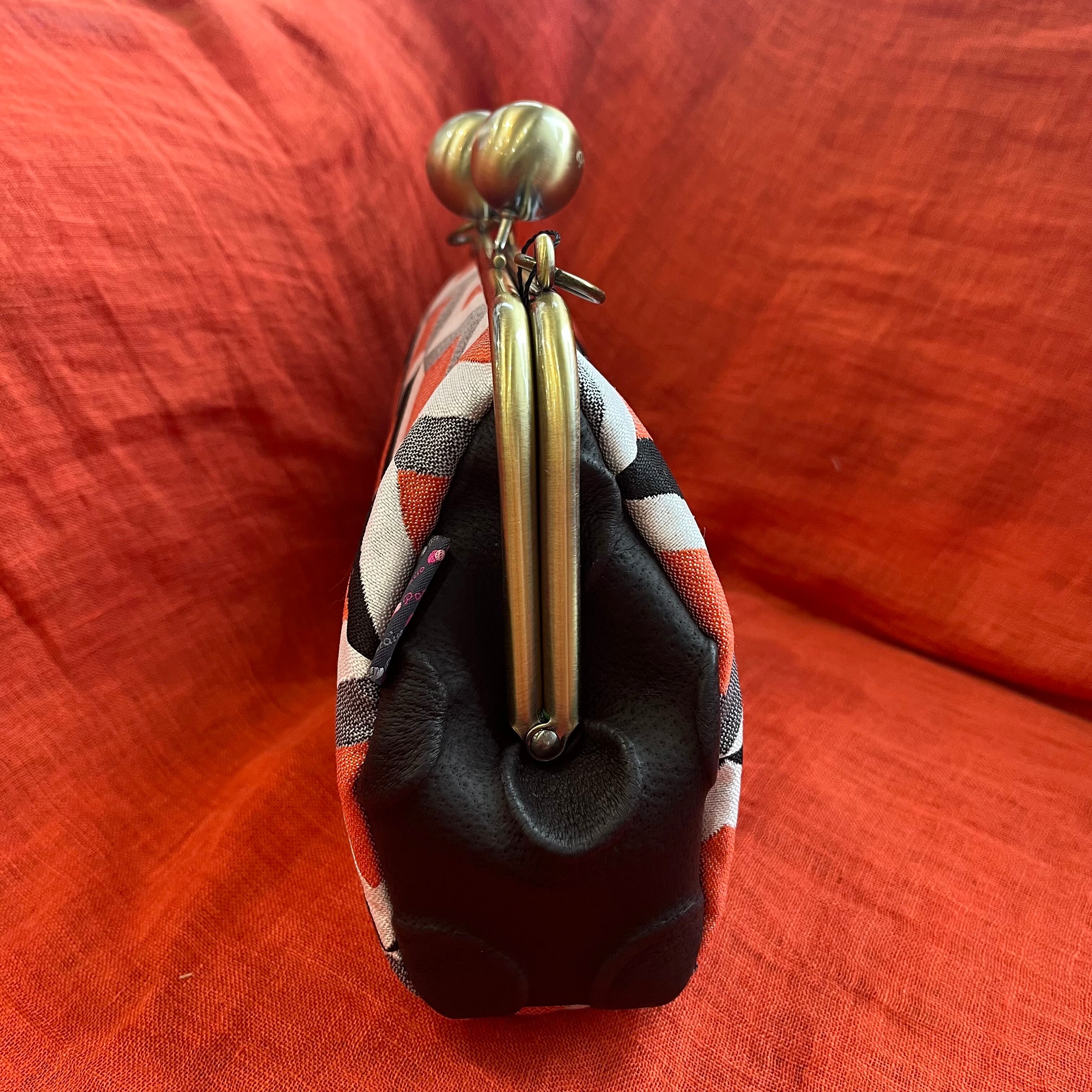 両面にホワイト・ブラック・オレンジの3色で幾何学模様の生地を使用しています。派手すぎず、シンプルすぎず、日常的に使用しやすいがま口バッグとなっています。