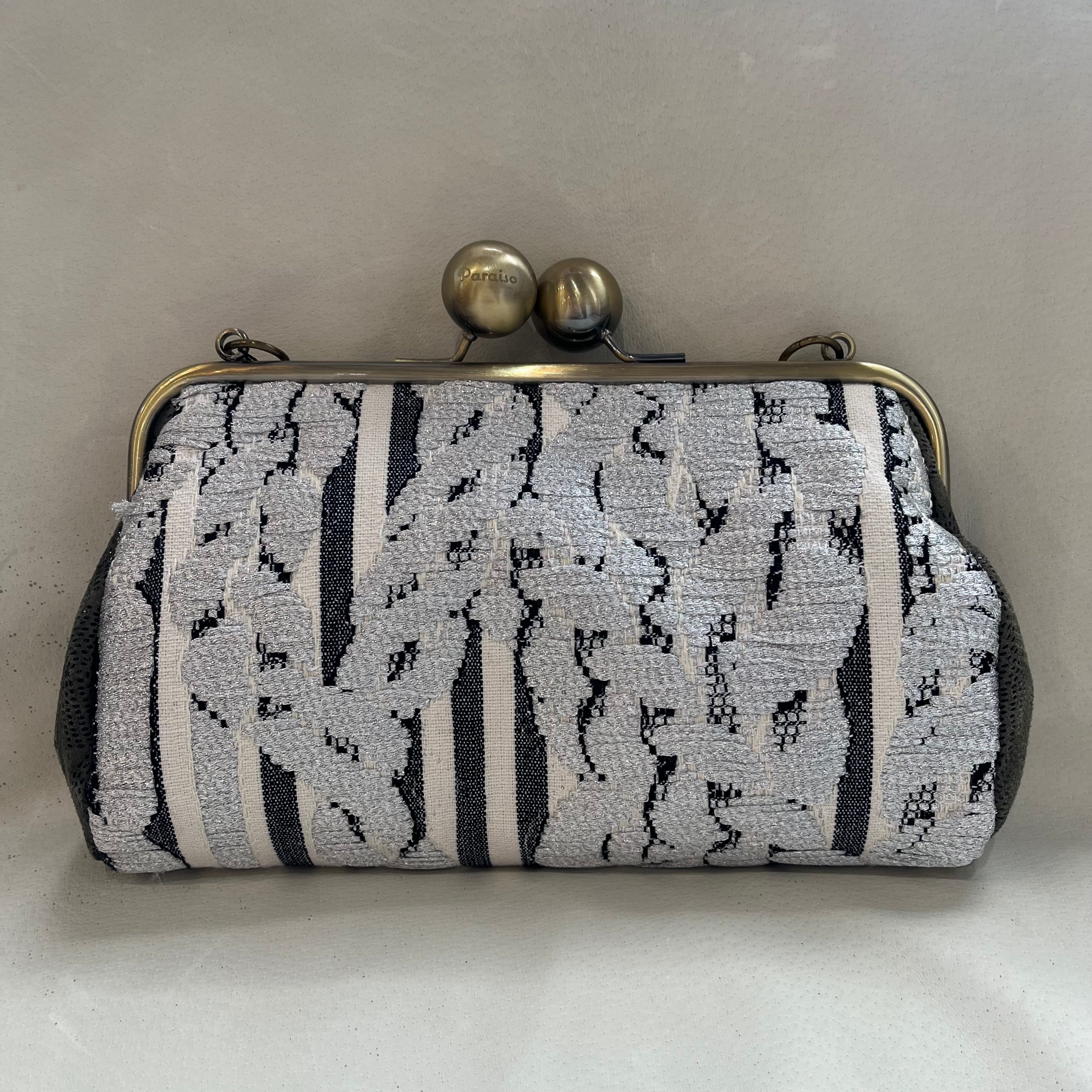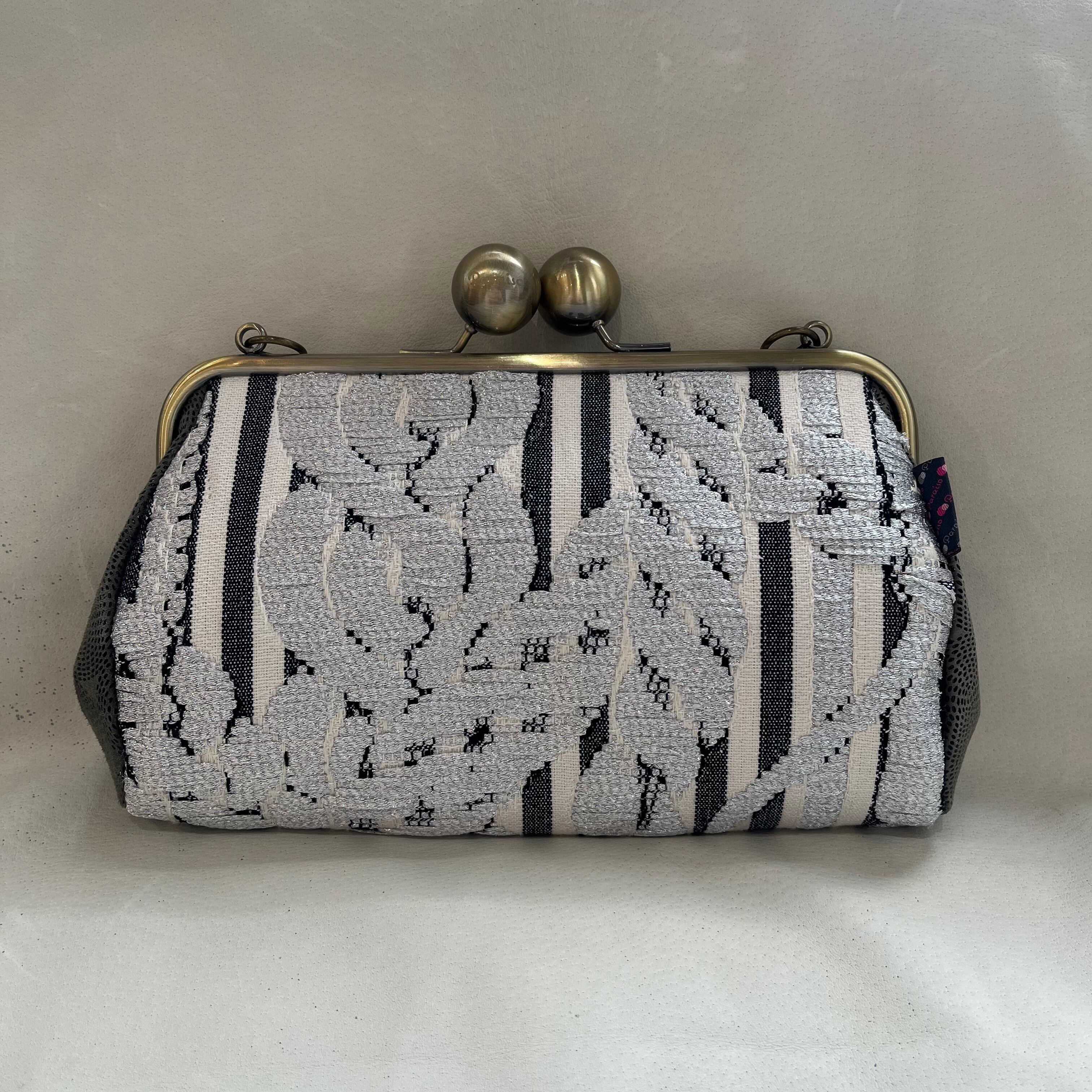 モノクロのストライプを基調とし、ラメ感のある植物柄の生地を使用しています。